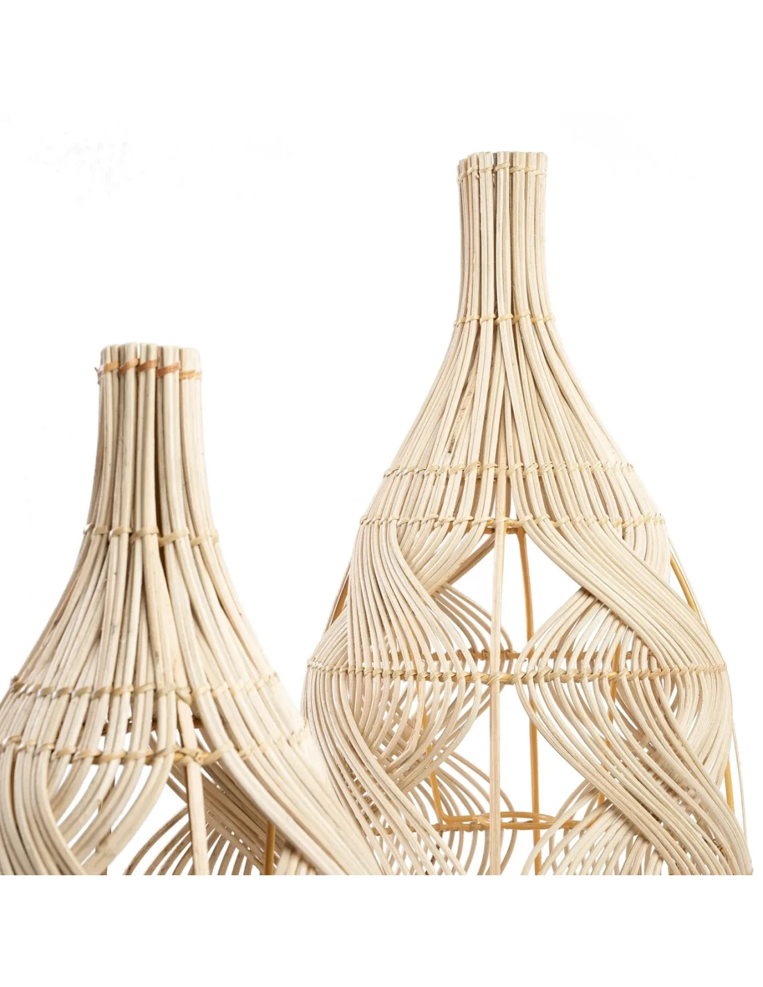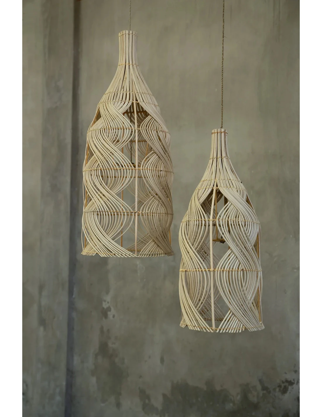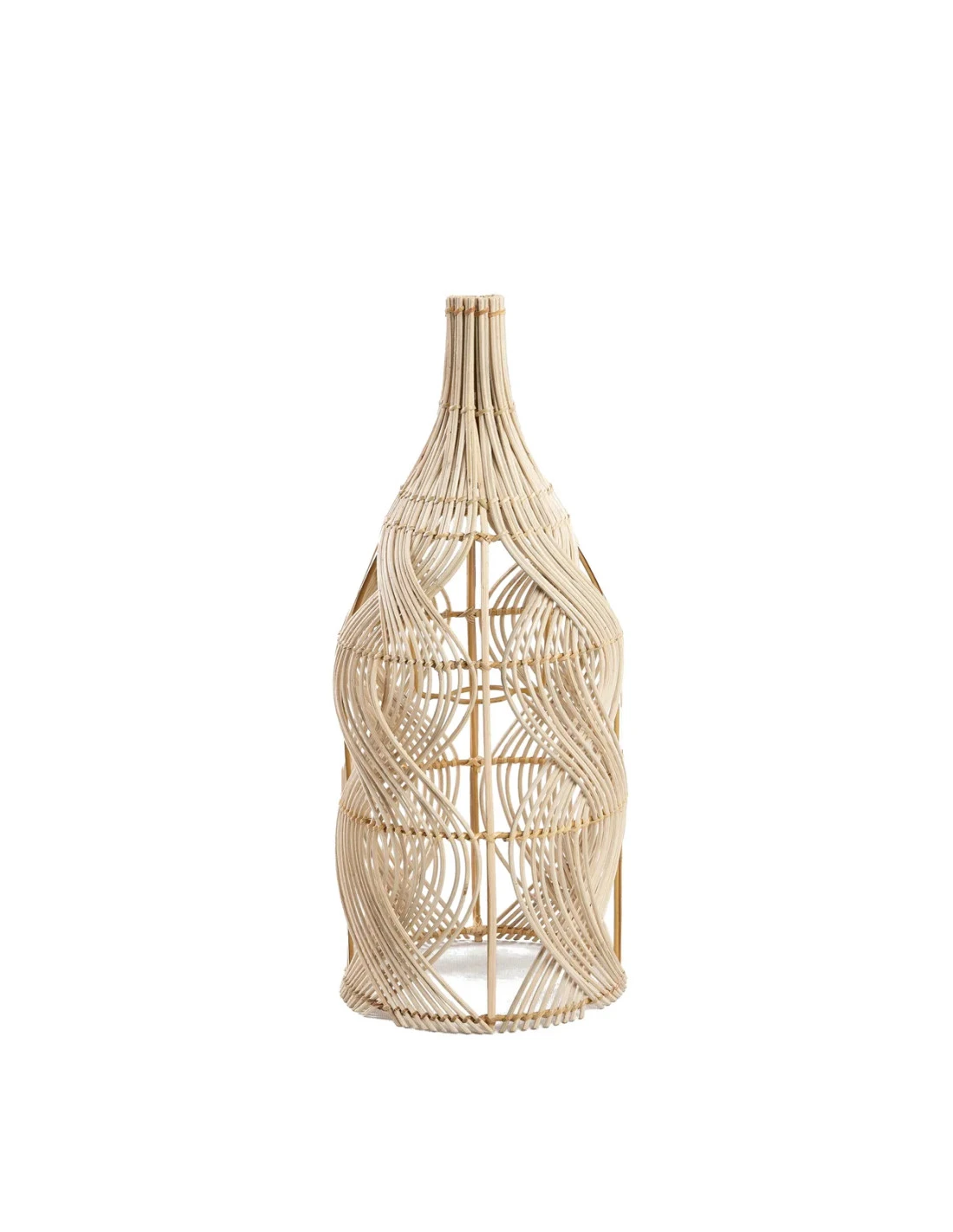 Nous aimons les produits polyvalents! Cette belle lampe peut être suspendue, posée au sol ou même sur une table (parfaite sur votre table de chevet). Elle est fabriquée en rotin, avec un motif magnifique qui s’affine vers le haut, en forme de bouteille. Disponible en deux tailles.