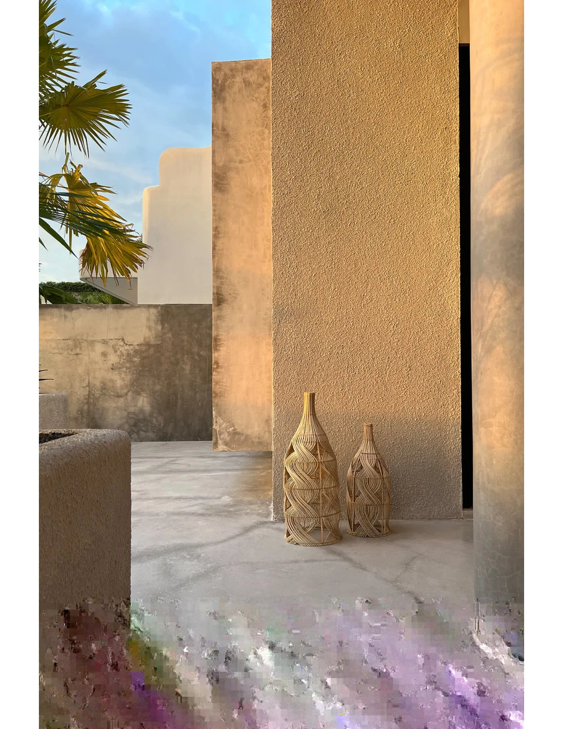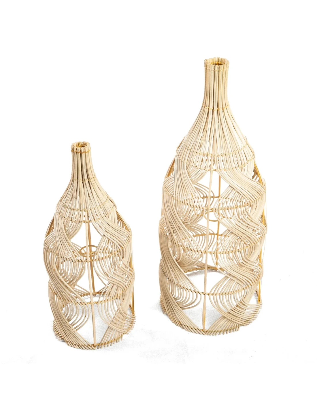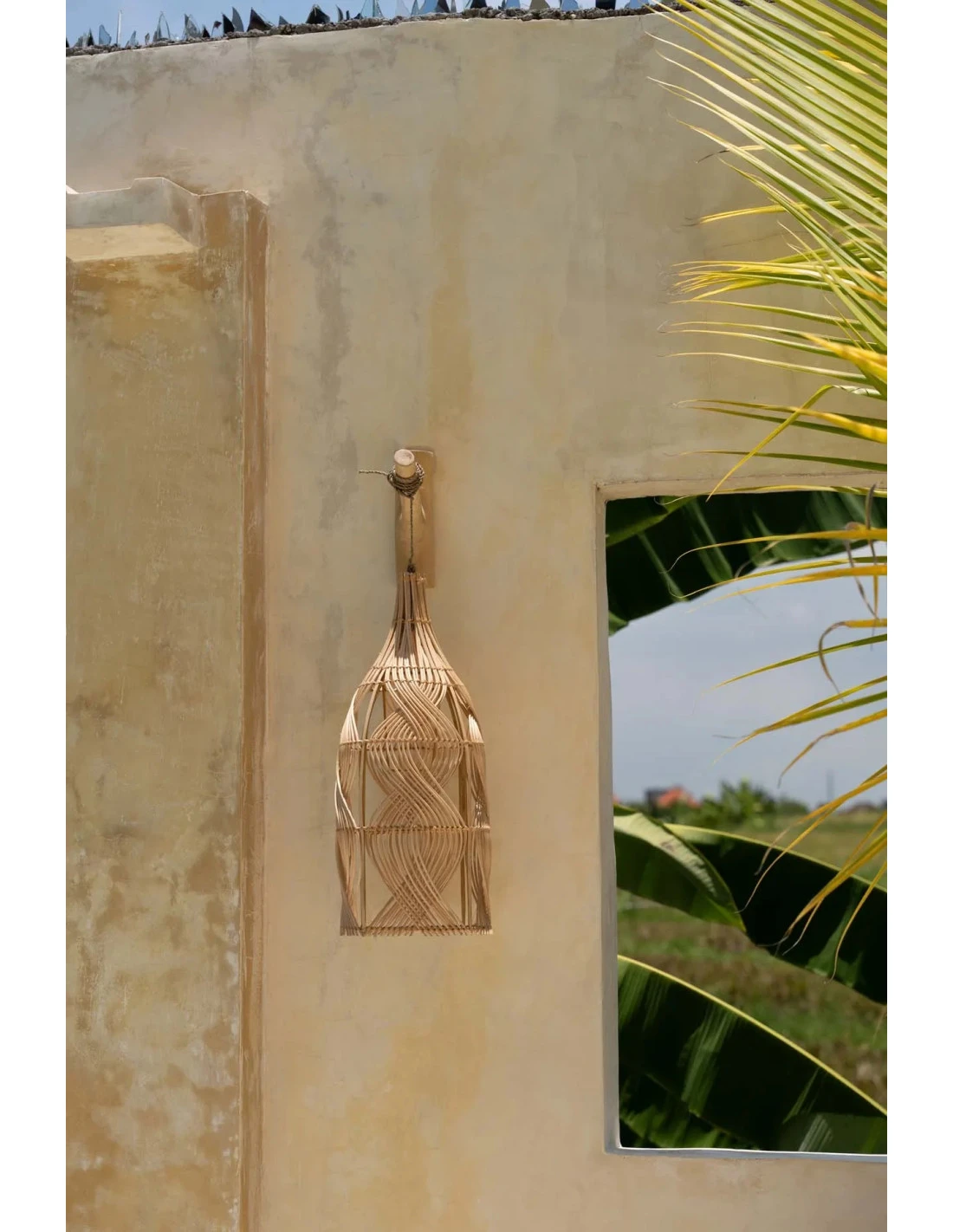 Nous aimons les produits polyvalents! Cette belle lampe peut être suspendue, posée au sol ou même sur une table (parfaite sur votre table de chevet). Elle est fabriquée en rotin, avec un motif magnifique qui s’affine vers le haut, en forme de bouteille. Disponible en deux tailles.