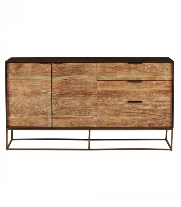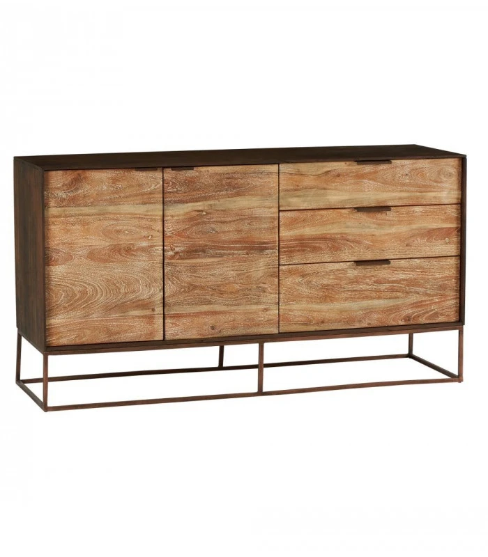 Le buffet Agra se compose d’une partie placard protégé par deux portes et d’une partie avec trois tiroirs.