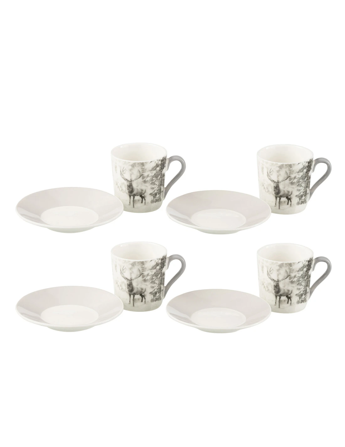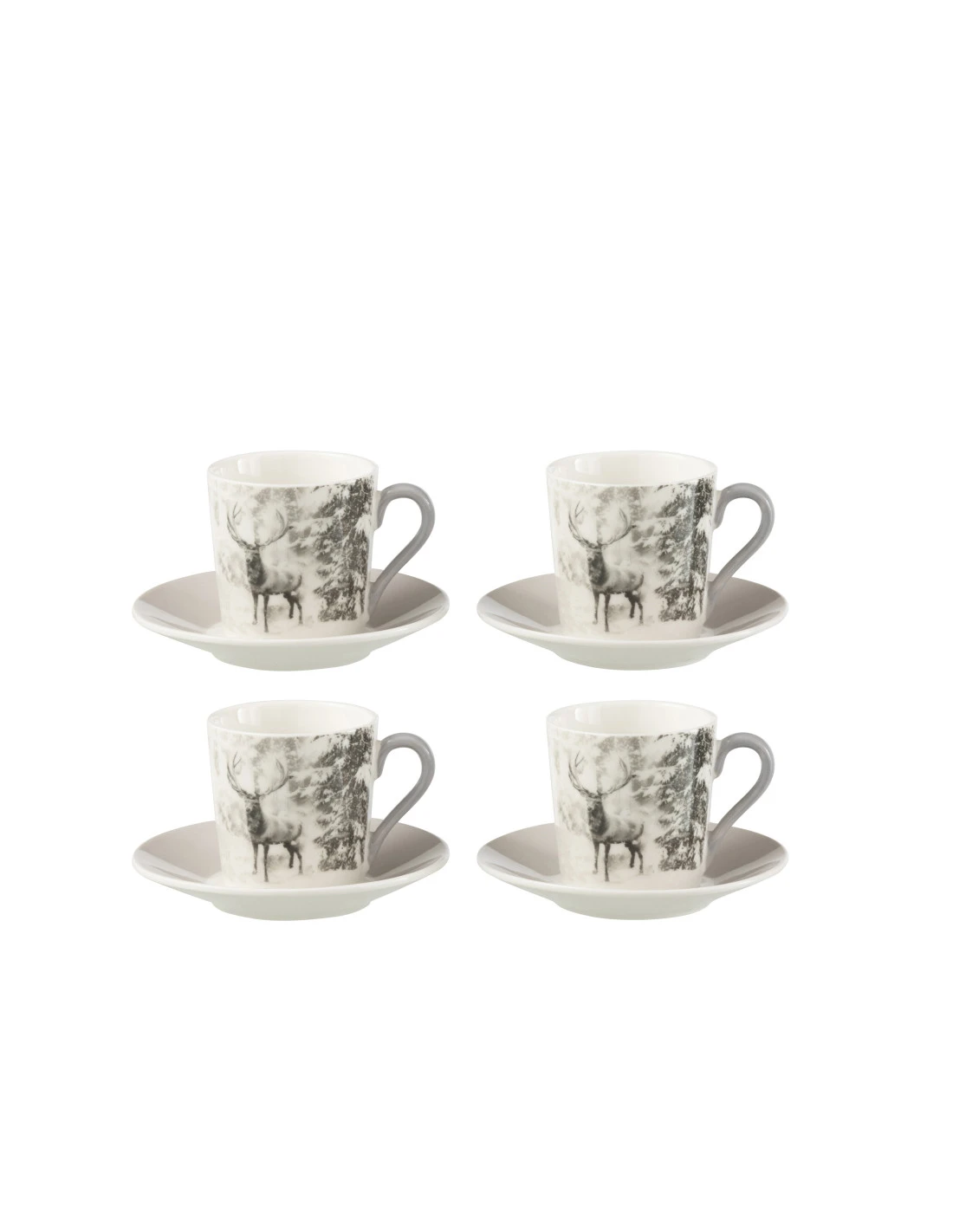 Boîte de 4 tasses à café et soucoupes en céramique gris avec motif renne.