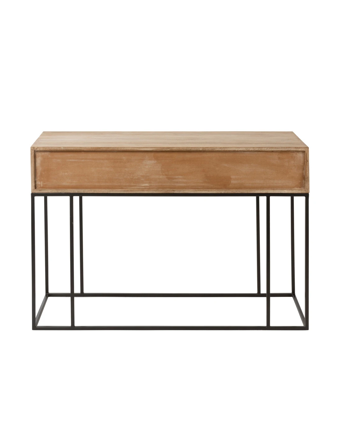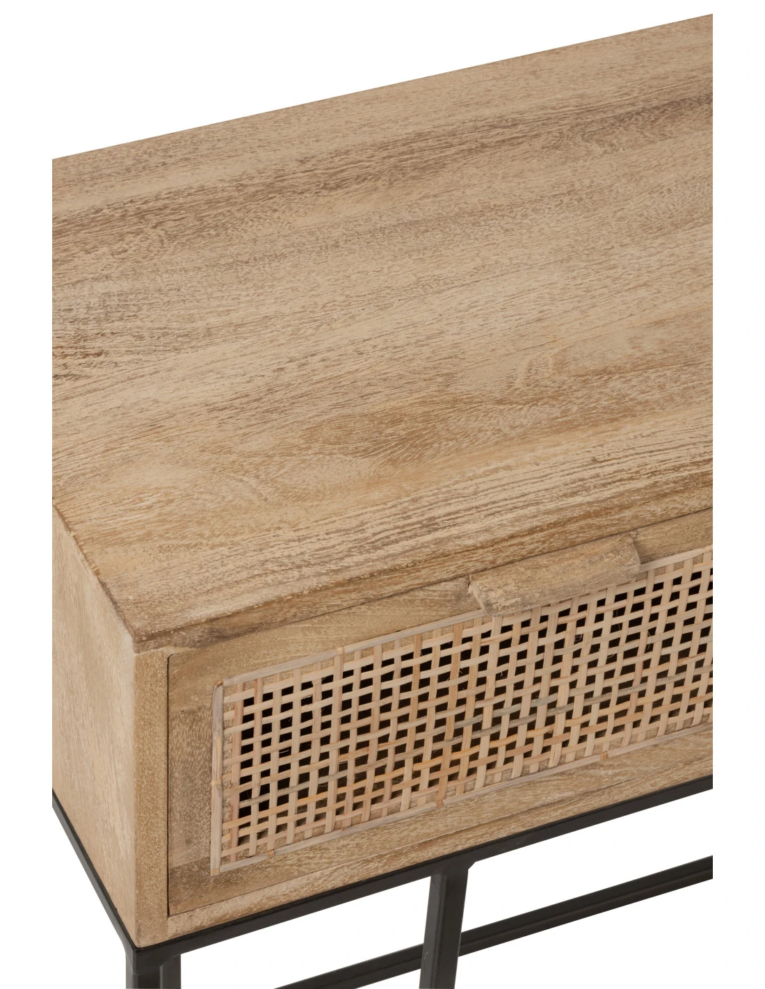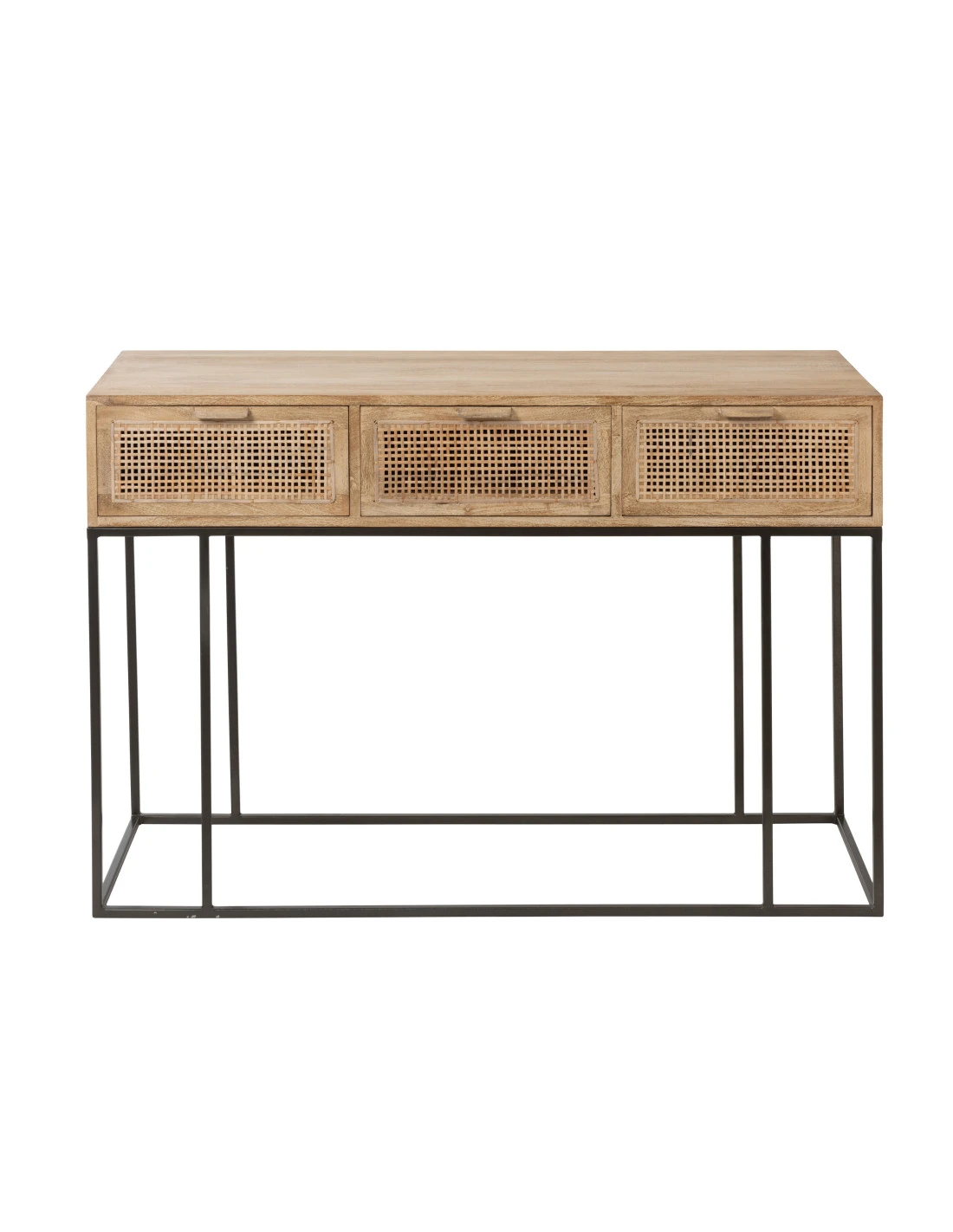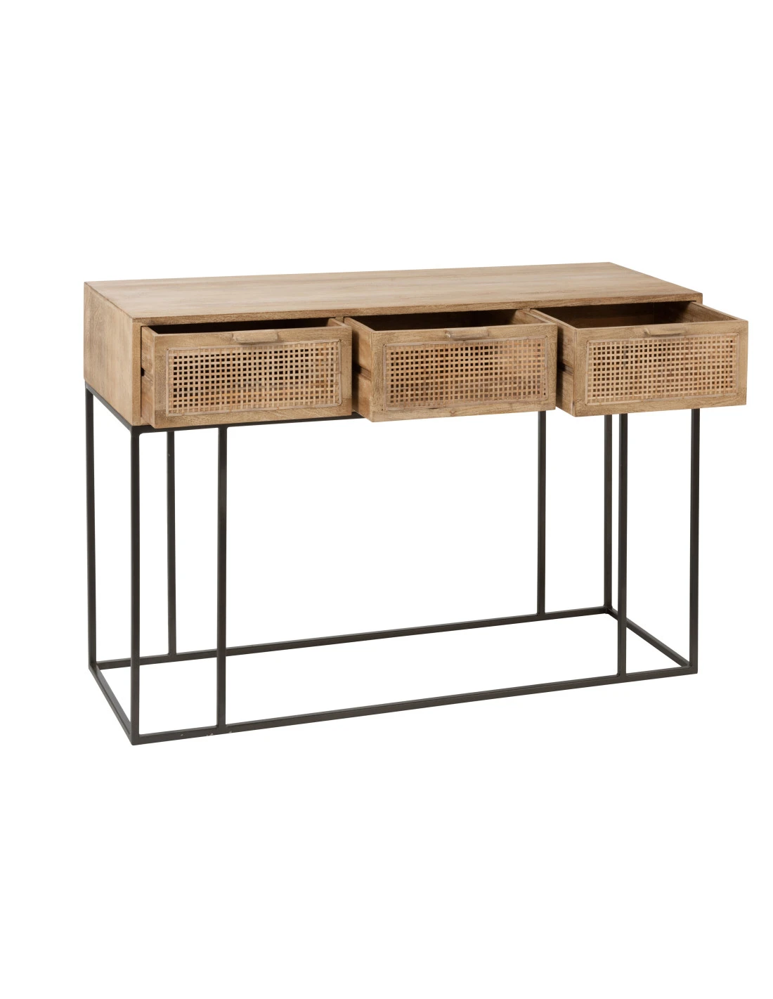 Console 3 tiroirs en bois de manguier tressé naturel. Dimension: Largeur 42 cm, Hauteur 80 cm, Longueur 120 cm. Poids 19.46 kg. Collection Zomer 2019. Couleur noire et naturelle. Composition: Mdf(15%), fer(30%), bois de manguier(40%), rotin(15%).