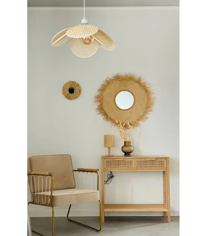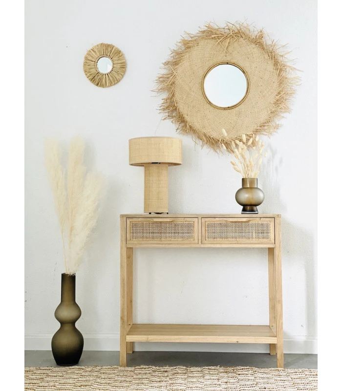 Console en MDF avec 2 tiroirs cannage naturel. Les pieds sont en bois d’hévéa pour une finition de qualité. Elle se mariera avec tous les styles d’intérieur et donnera une touche d’exotisme à votre déco ! (pieds à monter).