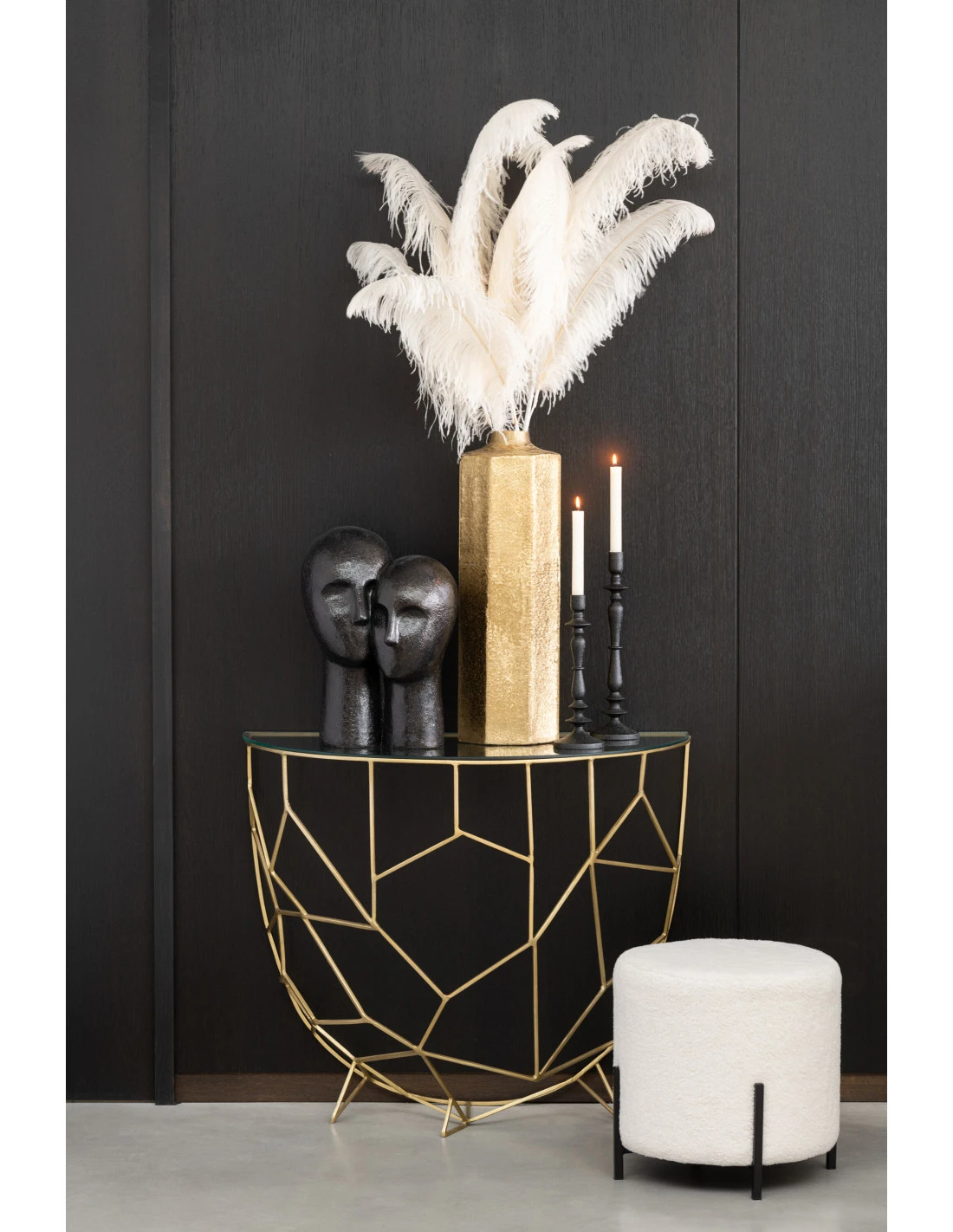 Console Moza Métal/Verre Or. Largeur: 46cm, Hauteur: 76cm, Longueur: 90cm, Poids: 11kg. Collection Hiver 2024. Couleur Or. Composition: Verre (30%), Fer (70%). Poids max supporté: 25kg.