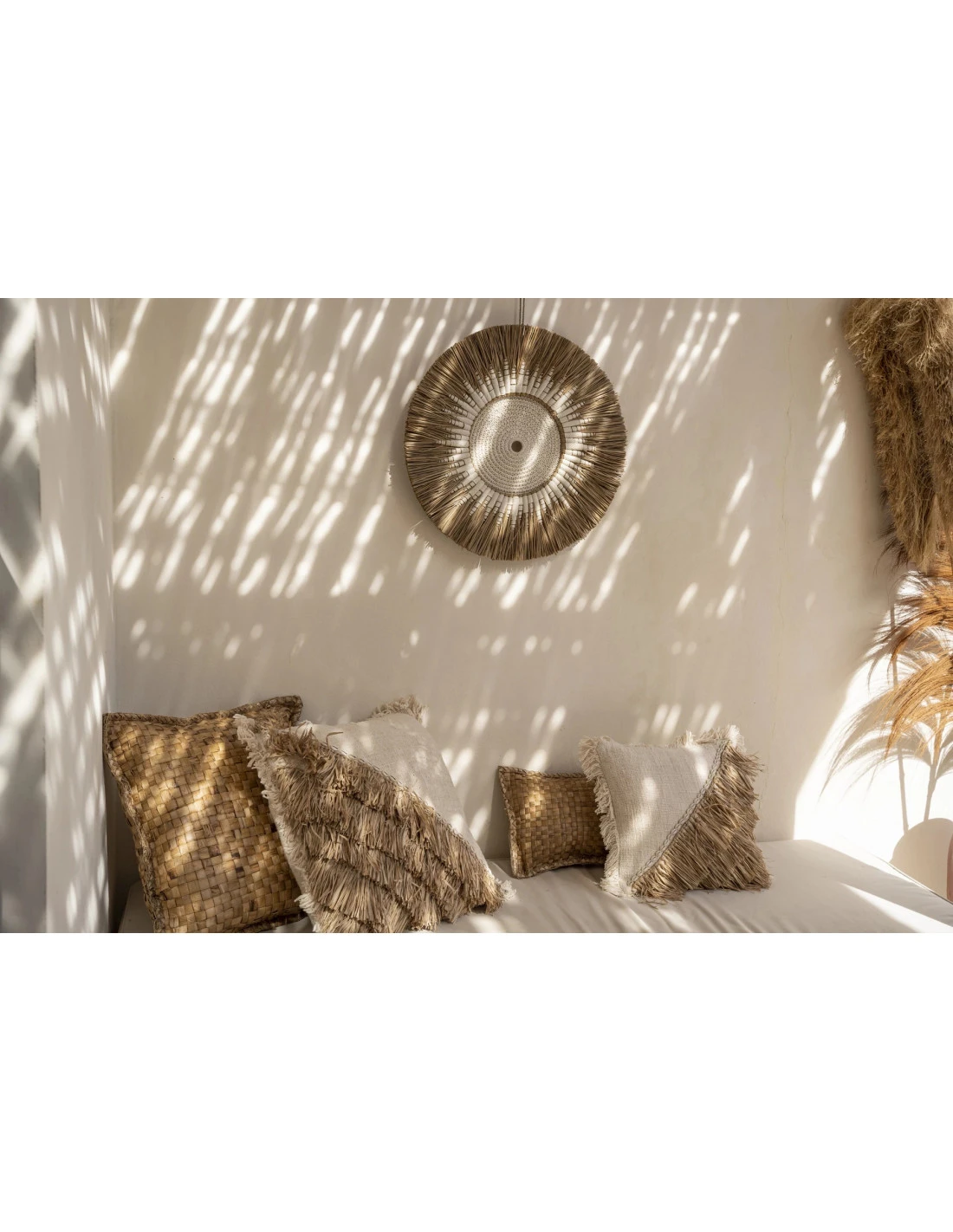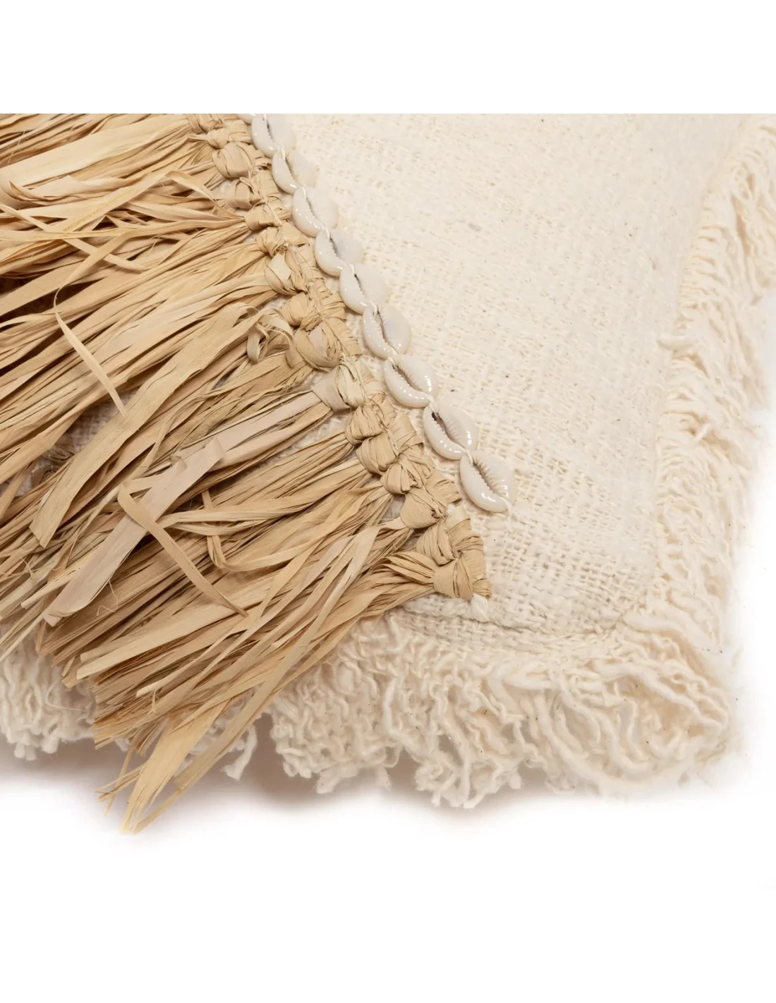 Cette housse de coussin nouvellement créée et originale est disponible en deux tailles et fabriquée en coton doux de haute qualité. La moitié du coussin est ornée de franges en raphia, ce qui lui donne une touché bohème ou côtière parfaite.