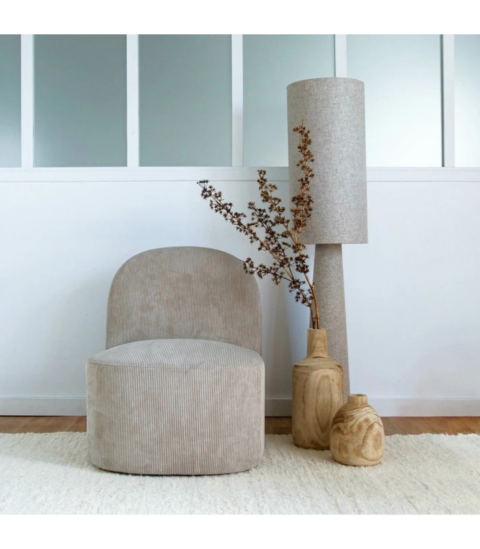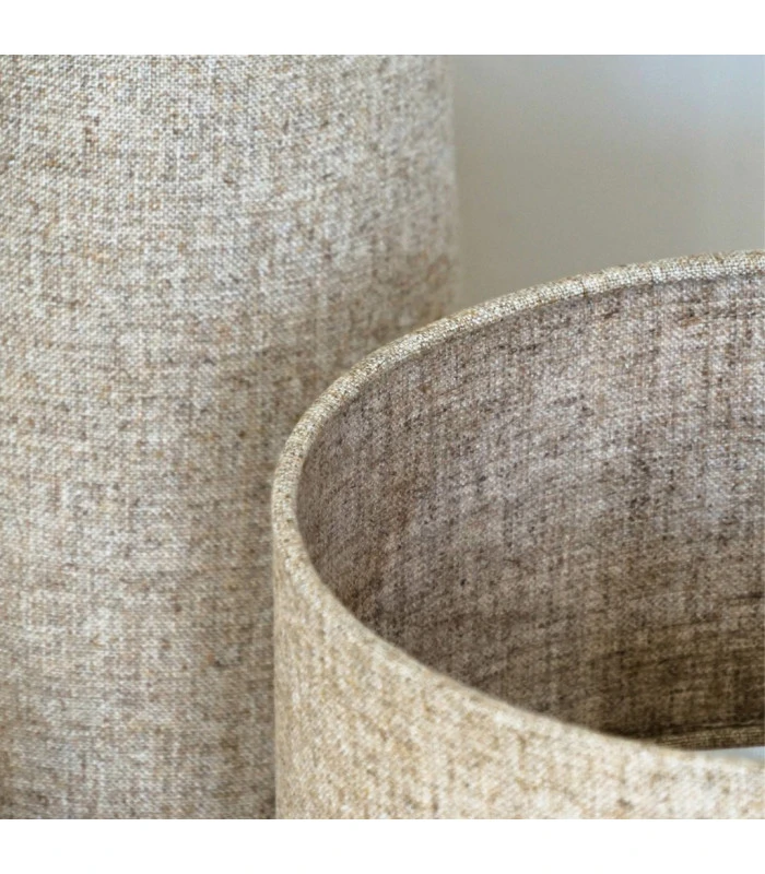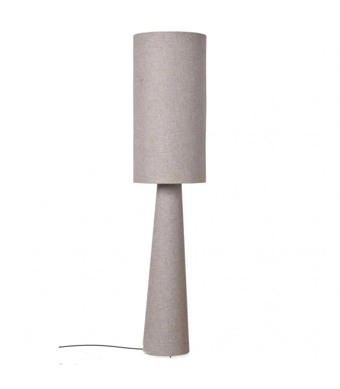 Lampadaire en lin avec deux points de lumière, un dans le pied et l’autre dans l’abat-jour.