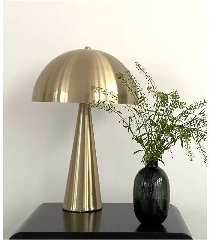 La lampe est composée d’un dôme et d’une base en métal doré satiné.