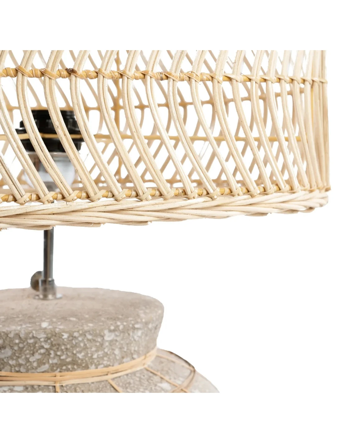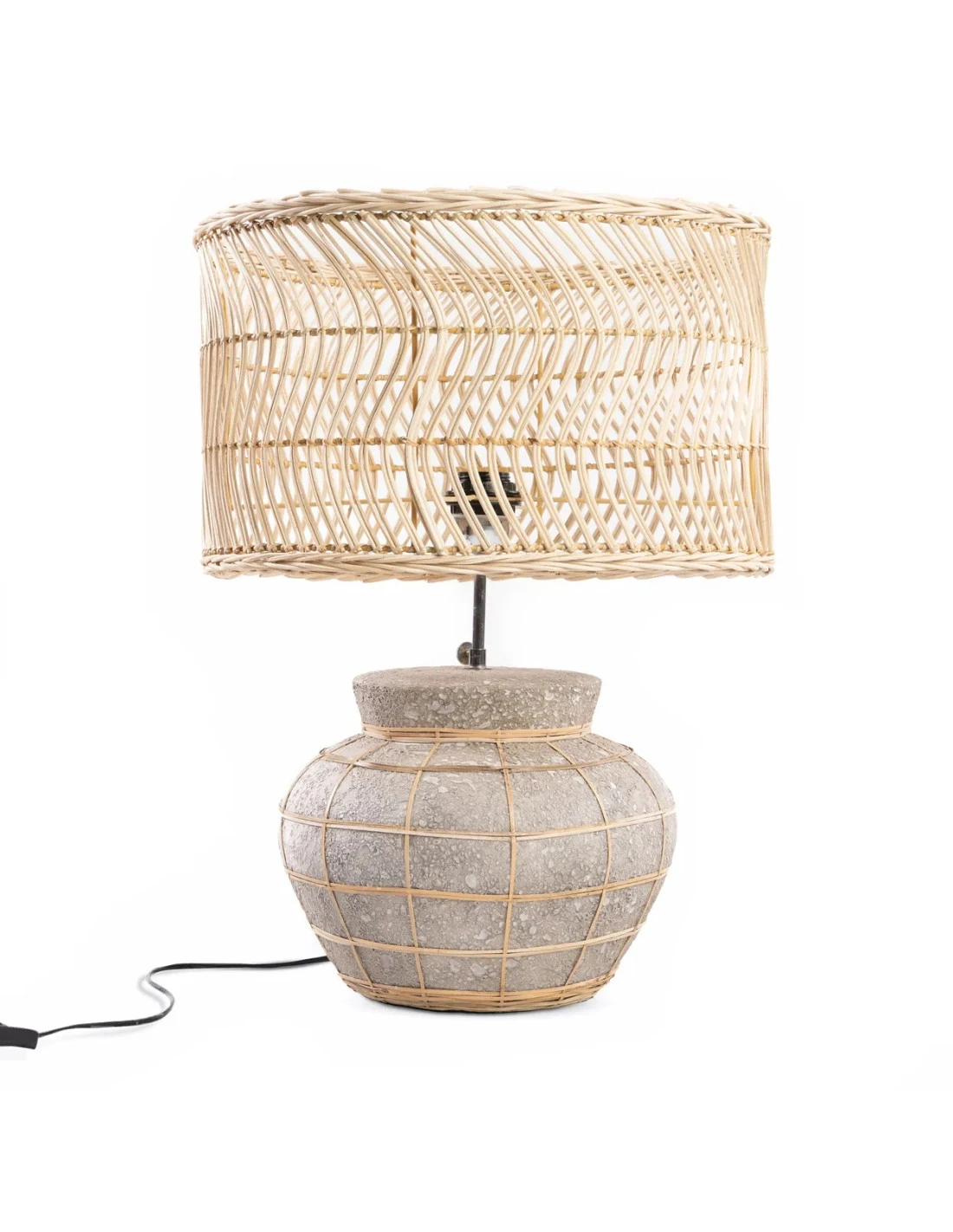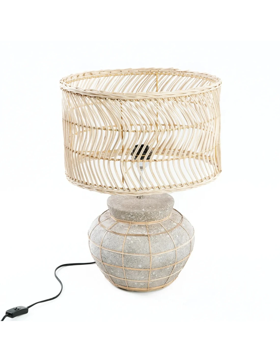 Tout est plus beau avec des courbes, comme cette lampe de table en terracotta et rotin. La Kythira a une belle allure artisanale, avec son pied de lampe gris (avec grille en rotin) et son rotin naturel sur la forme de la lampe qui se marient parfaitement. Parfait pour votre table de nuit ou console! Couleur: Gris béton Naturel. Taille: 48cm de haut, 40cm de large, 30cm de long. Matériaux: Terracotta, Rotin, Herbe. Câblage inclus? Oui (prise standard de l’UE – Type C, douille standard E27).