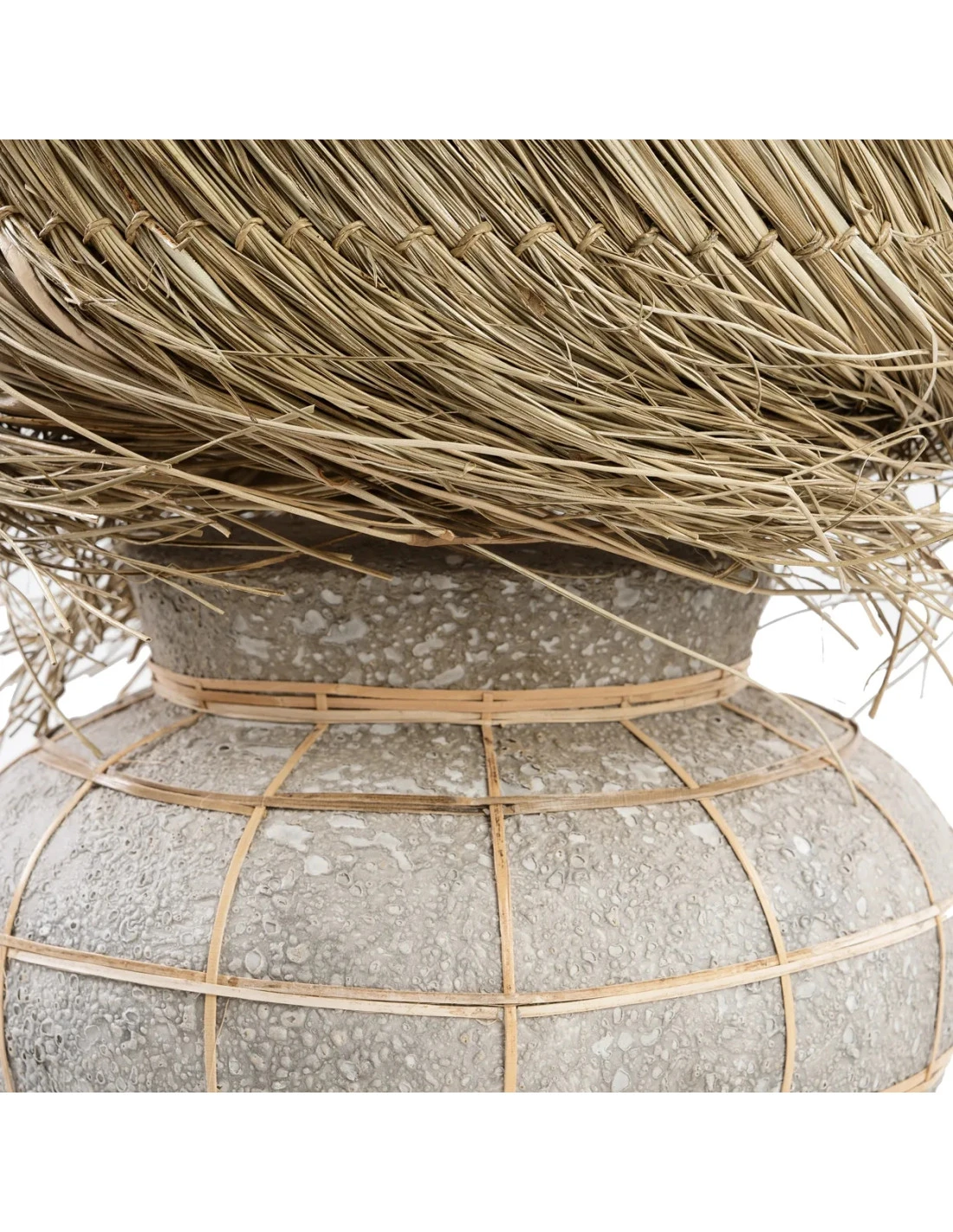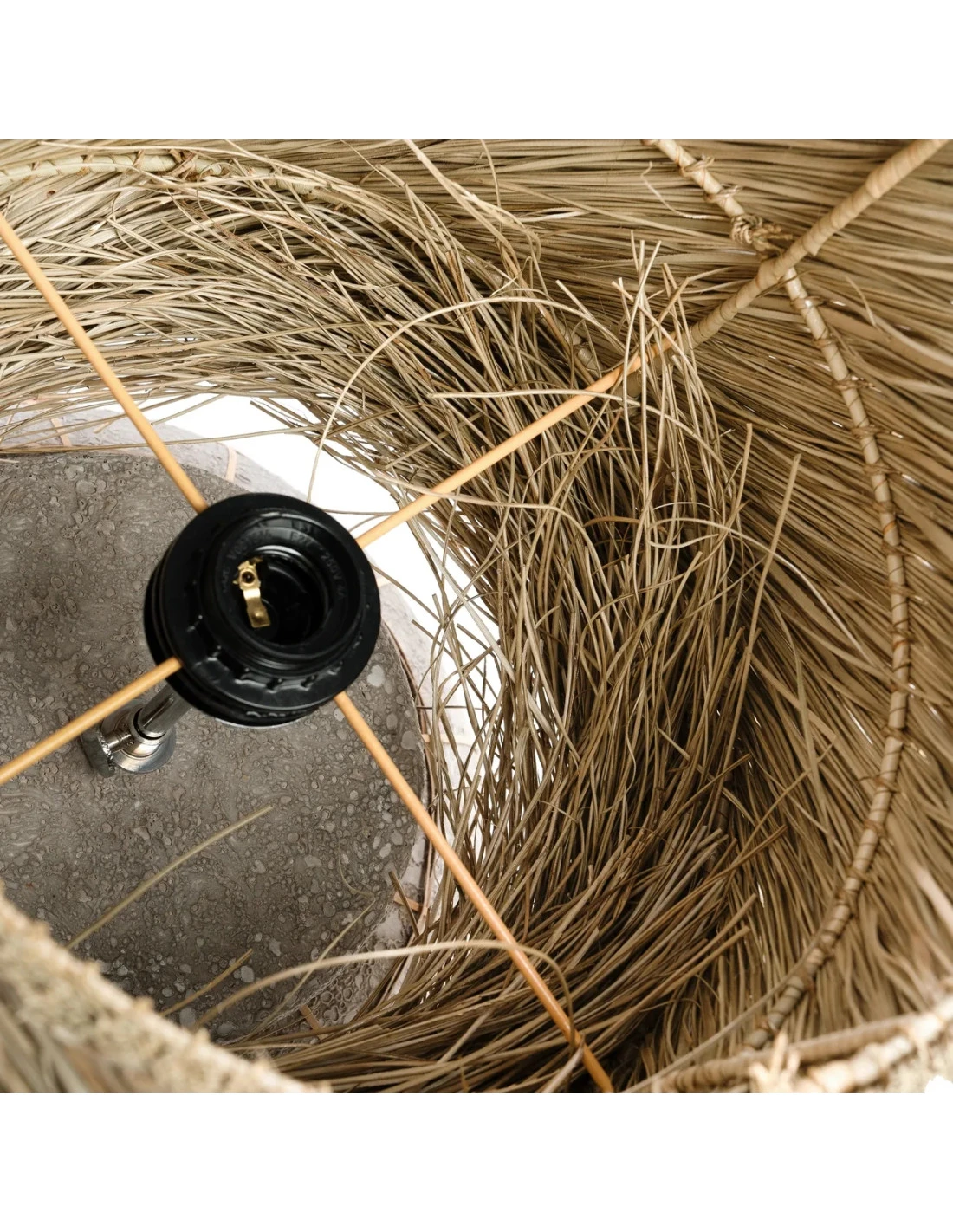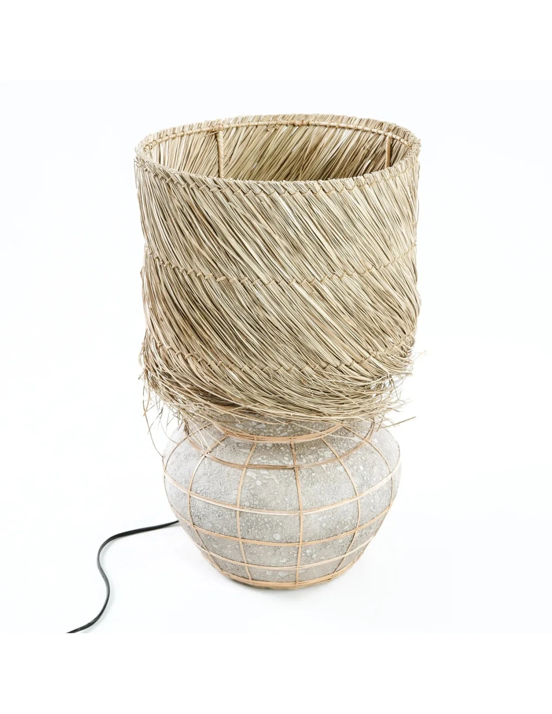 Here is the translated text: « Un incontournable du rêve ! La lampe de table Lipsi est parfaite pour votre table de nuit, console ou petit coin oublié de votre salon. Pied en terracotta gris clair avec un treillis en rotin, abat-jour en pandanus. Un véritable accroche-regard ! Couleur : Gris ciment Naturel. Hauteur : 48 cm. Largeur : 30 cm. Longueur : 30 cm. Matériaux : Terracotta, Rotin, Herbe. Câblage inclus ? Oui (standard européen – fiche de type C, douille standard E27). »