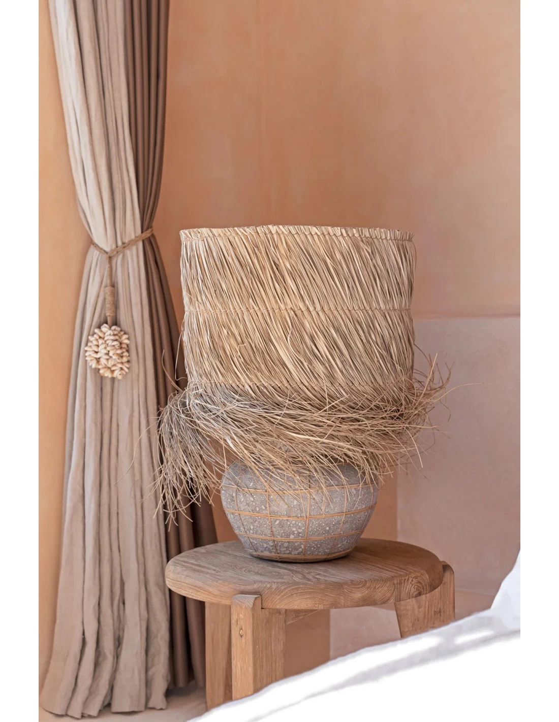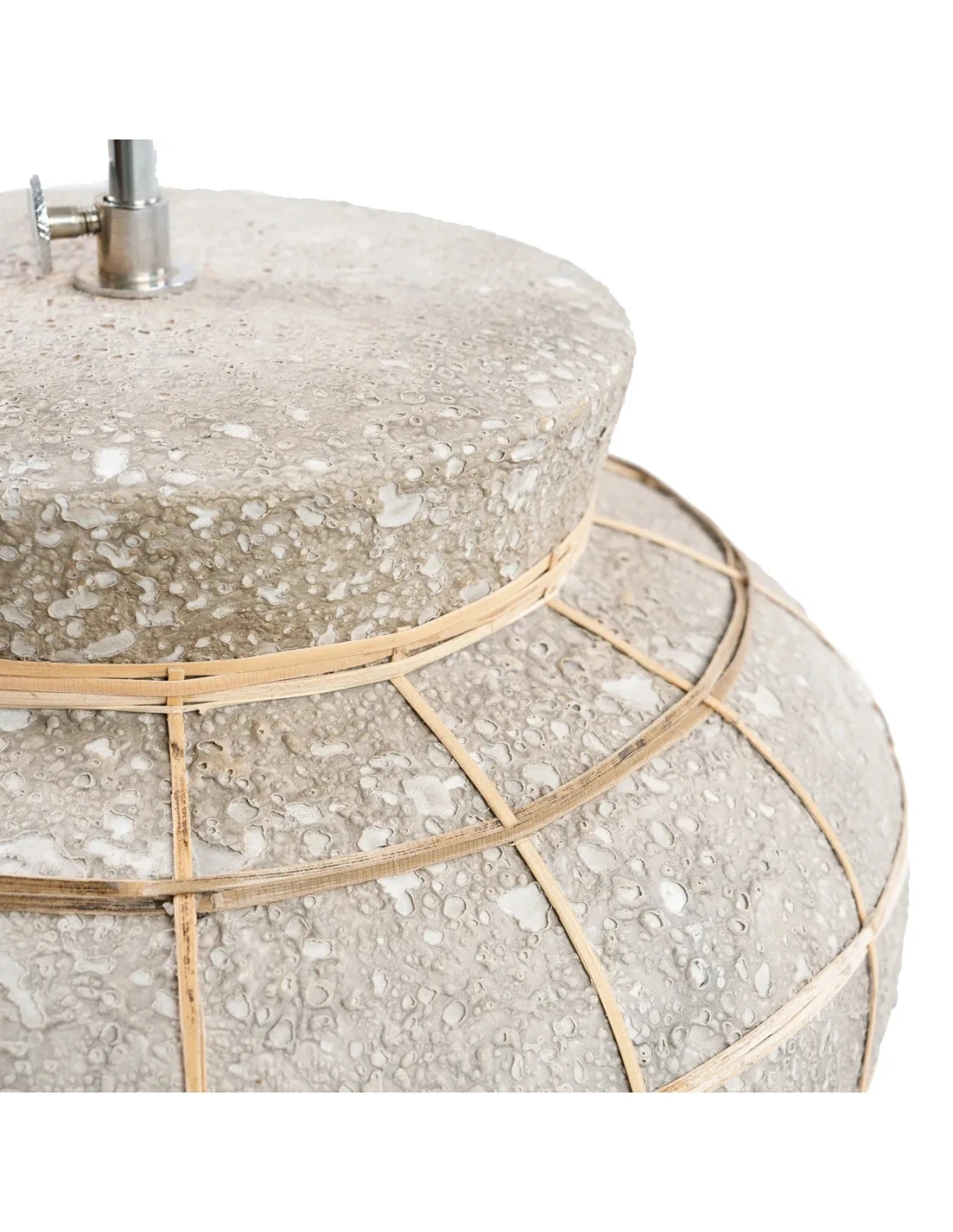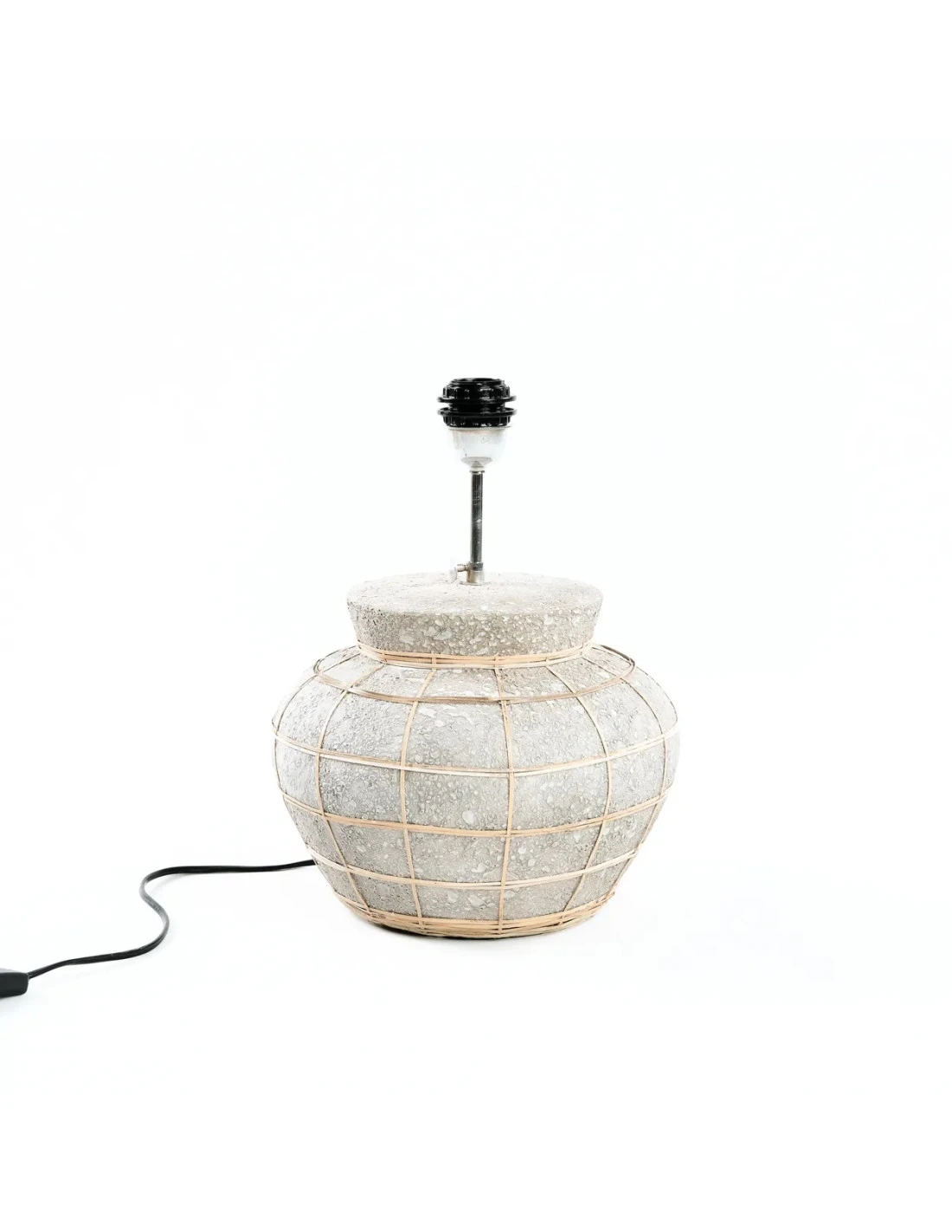 Here is the translated text: « Un incontournable du rêve ! La lampe de table Lipsi est parfaite pour votre table de nuit, console ou petit coin oublié de votre salon. Pied en terracotta gris clair avec un treillis en rotin, abat-jour en pandanus. Un véritable accroche-regard ! Couleur : Gris ciment Naturel. Hauteur : 48 cm. Largeur : 30 cm. Longueur : 30 cm. Matériaux : Terracotta, Rotin, Herbe. Câblage inclus ? Oui (standard européen – fiche de type C, douille standard E27). »