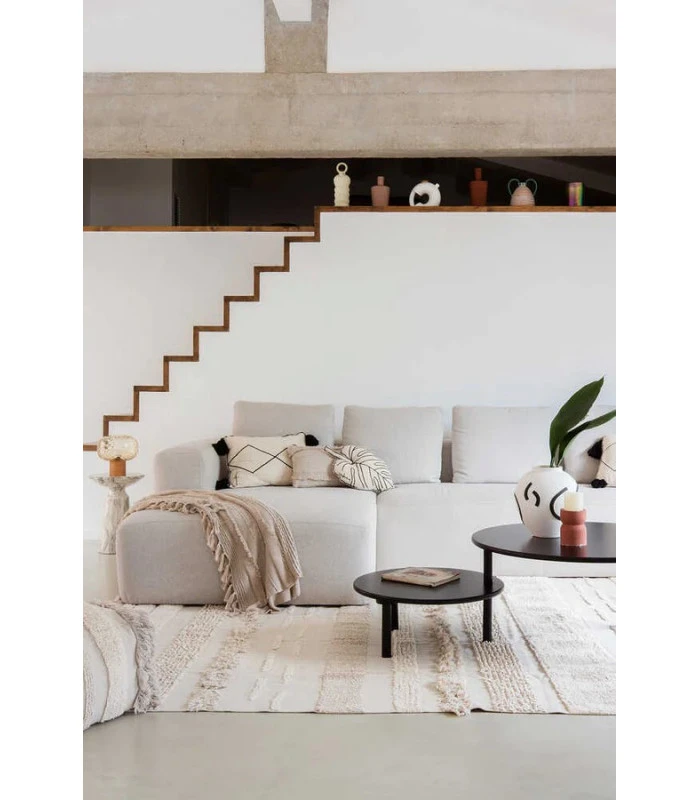 Un tapis de la collection Berber qui se distingue par ses finitions artisanales. La broderie sur les bords frangés et le tuftage mélangé ajoutent une touche vintage à une pièce qui s’intègre à toutes les décorations.