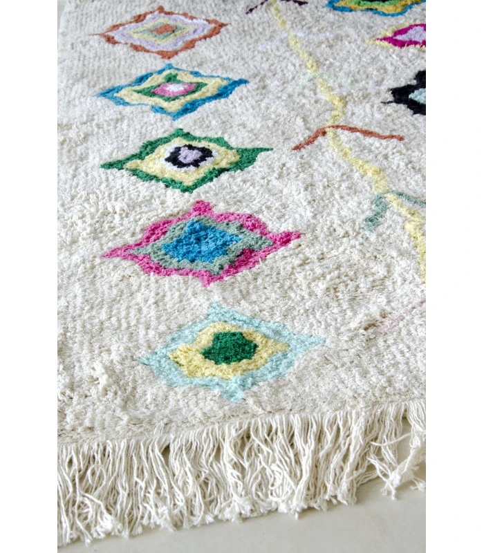 Avec les couleurs des marshmallow et des franges amusantes, ce tapis Hippy va plaire à toute la famille et va s’adapter parfaitement au salon et salle à manger, à la chambre d’adulte, de bébé et d’enfant, fille ou garçon. 100% coton, lavable en machine (capacité 6 kg). Fait main, ce modèle est léger et doux par son élaboration en coton.