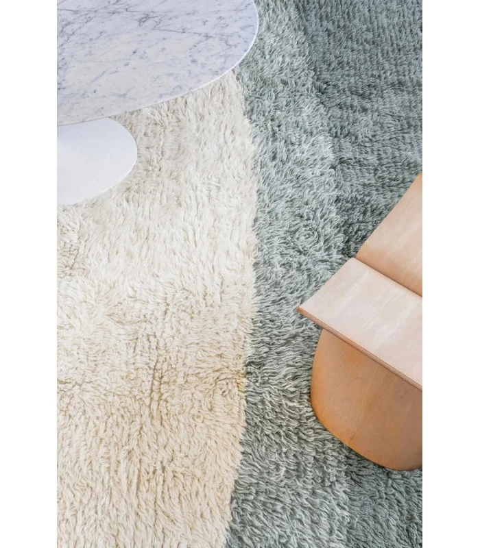 Tapis rectangulaire en laine lavable à poils moyens, doux avec un dégradé de ces trois couleurs de Into the Blue dans les tons bleu fumée, naturel et gris argenté. Fini avec des franges en laine naturelle par nos artisans talentueux.