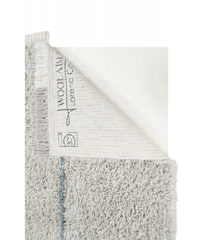Tapis en laine lavable à la main avec de longs cheveux de couleurs naturelles mélangé avec du gris argenté et contrasté avec le bleu fumée. Fini avec des franges inégales donnant au tapis la touche bohème-hippie que vous recherchez.