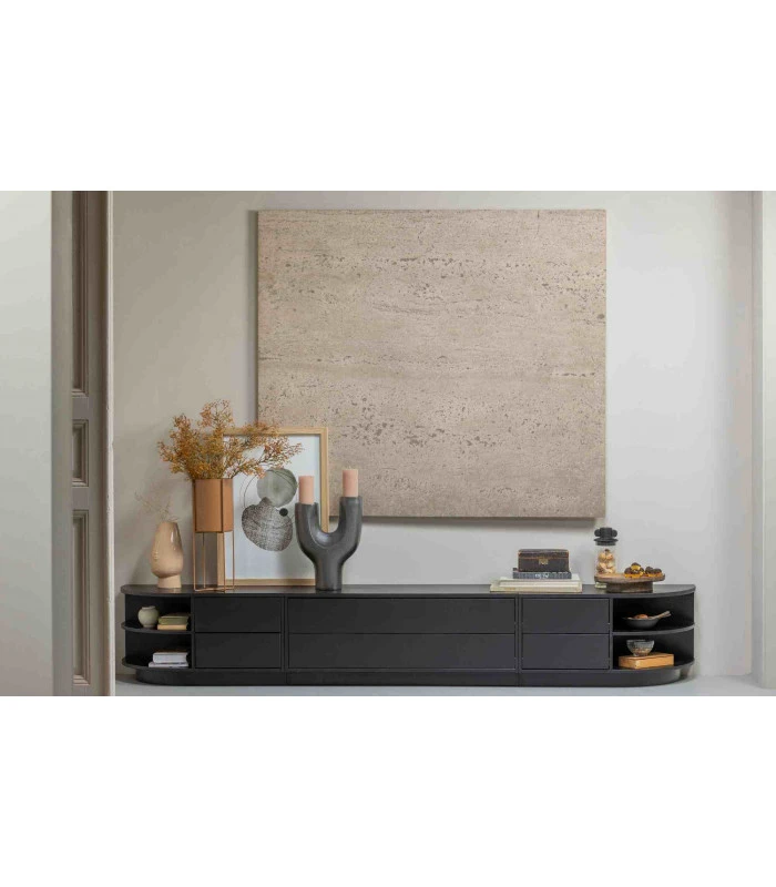 Le meuble TV dispose de deux tiroirs spacieux, chacun ayant une capacité de 11,5x93x30 cm (HxLxP). Le bord inférieur du meuble TV Finca laisse un espace de 7 cm à l’avant, ce qui donne l’impression que le meuble TV est flottant.
