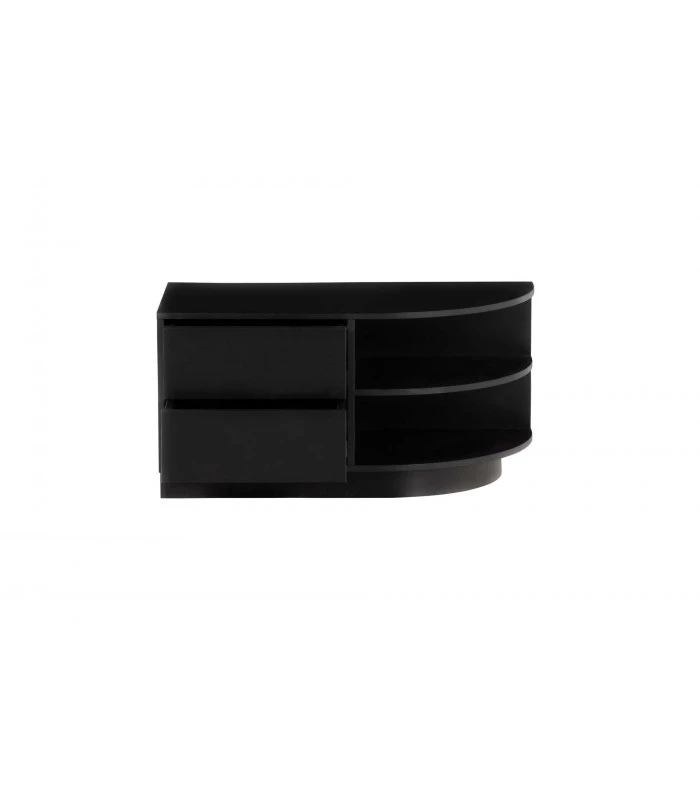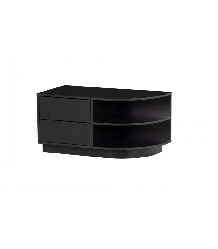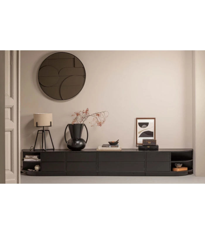 Le meuble TV Finca avec élément rond est une véritable pièce maîtresse dans le salon. Les étagères ouvertes offrent suffisamment d’espace pour présenter votre plus belle décoration intérieure. Les deux tiroirs permettent de conserver un autre grand espace de rangement à l’abri des regards. Le bord inférieur du meuble TV laisse un espace de 7 cm à l’avant, donnant au meuble l’apparence de flotter.