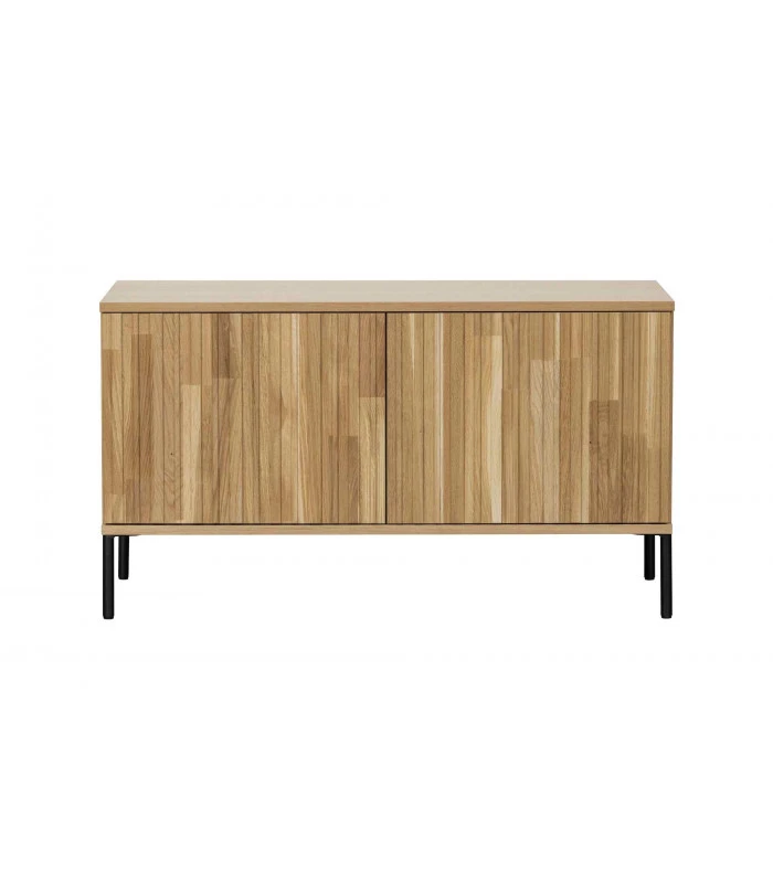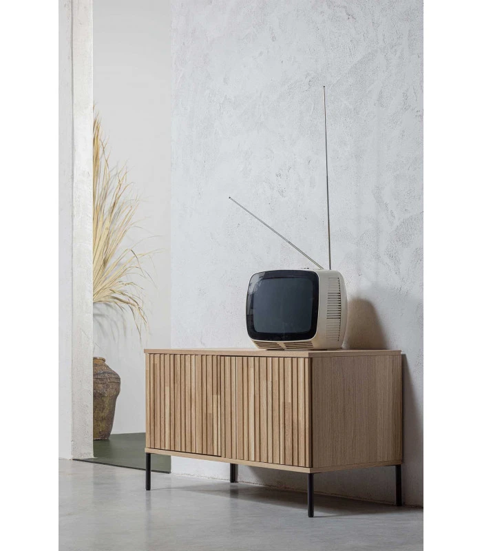 Le meuble TV mesure 56 cm de haut, 100 cm de large et 44 cm de profondeur. Les deux portes ont chacune une hauteur de 37 cm, une largeur de 50 cm et une épaisseur de 2 cm.