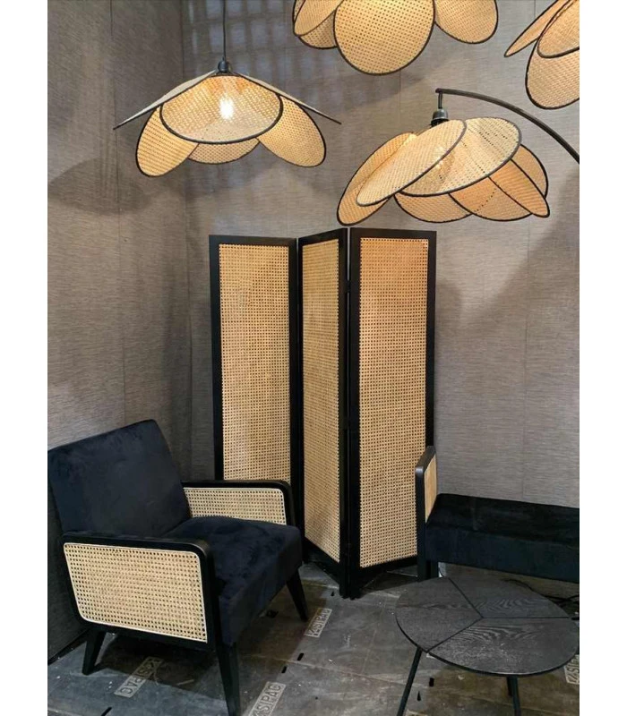 Suspension Evasion avec abat-jour canné en rotin gansé noir.