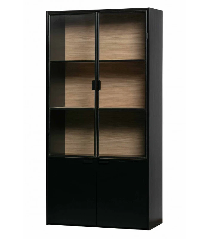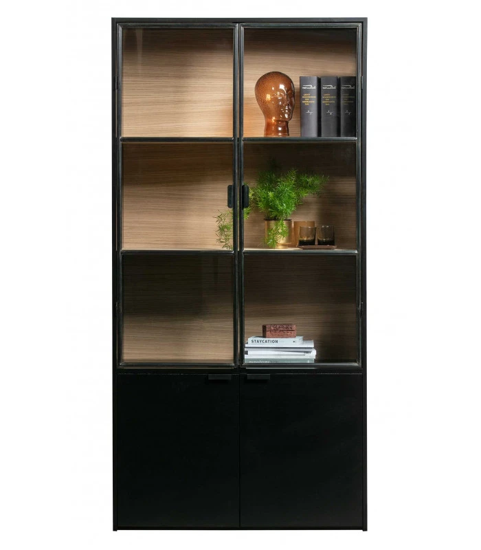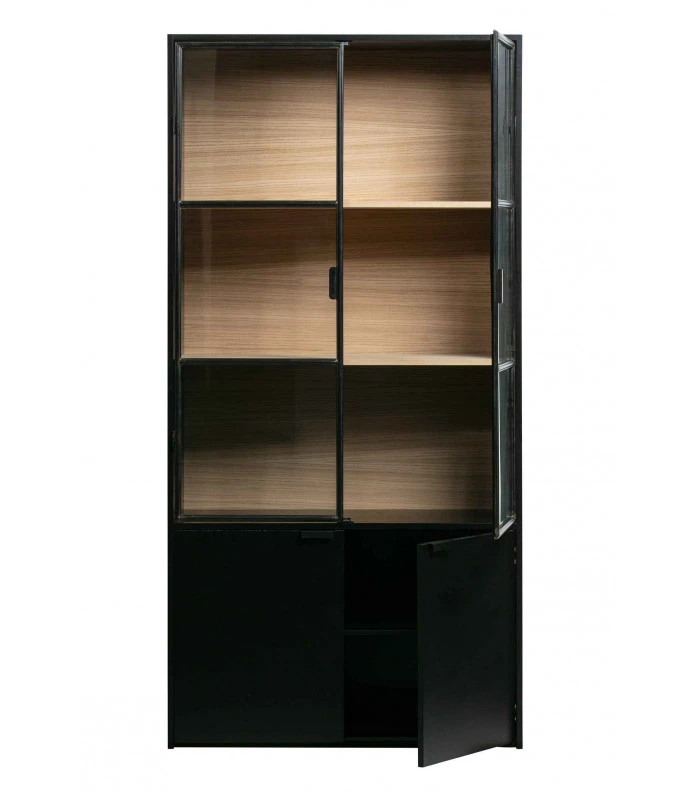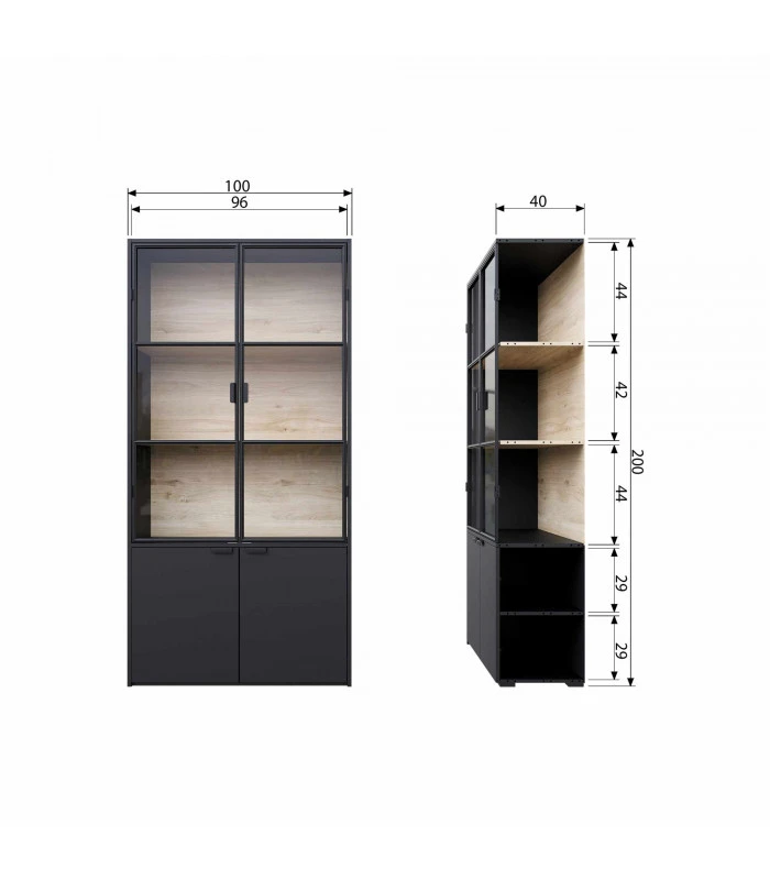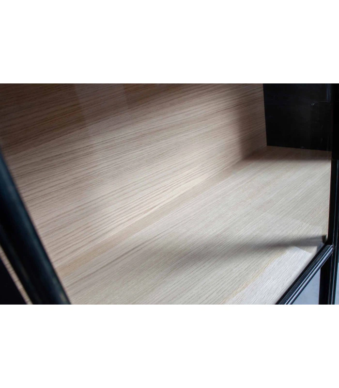 La vitrine est faite en pin massif (FSC) au fini noir. L’intérieur de l’armoire est en bois de chêne clair ( aggloméré mélamine ). La hauteur entre l’étagère supérieure et le haut de l’armoire est de 44 cm, entre les étagères centrales de 42 cm de haut et l’espace inférieur de 44 cm de haut. Les portes sont en métal noir et en verre.
